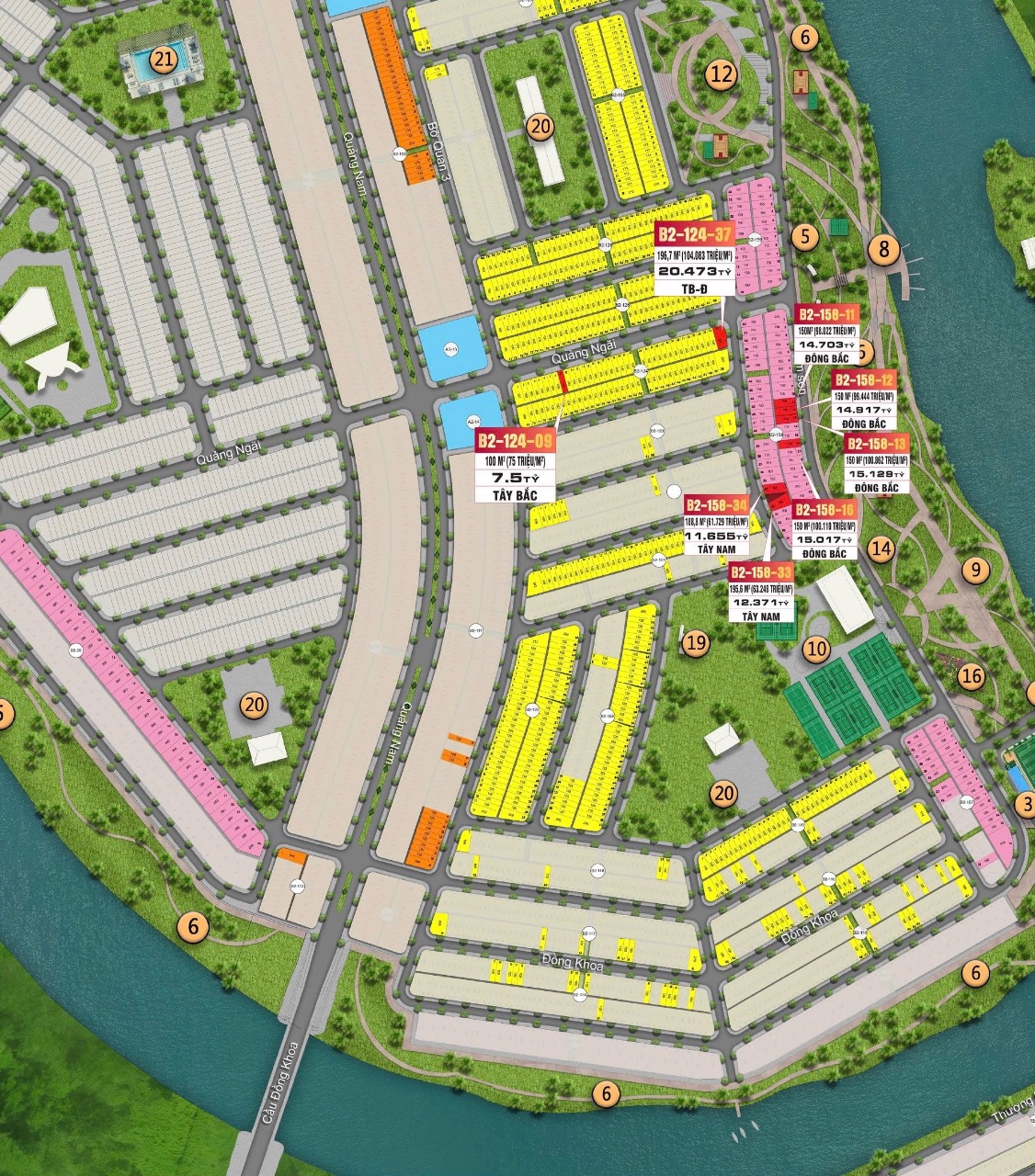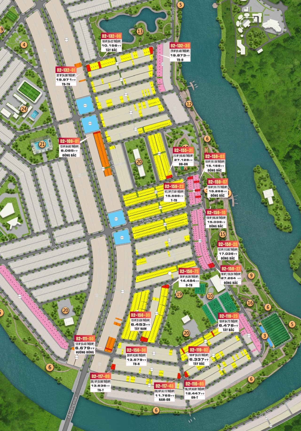 - Biệt thự mặt sông: 92 căn, 150m², 260m² và lô góc 320m²-400m².