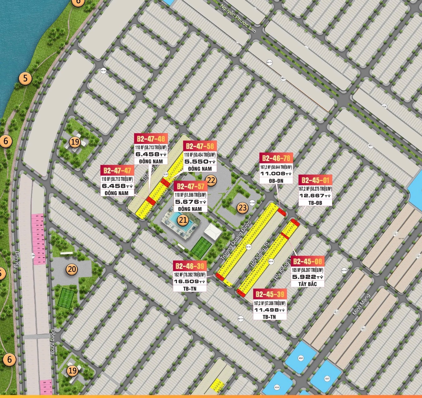 - Liền kề mặt sông: 62 căn, 105m², ngang 5m.