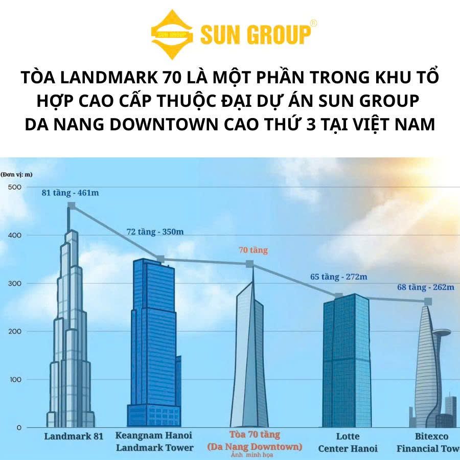 Landmark 70 Đà Nẵng – biểu tượng mới nơi thành phố biển đáng sống bậc nhất Việt Nam. Sở hữu chiều cao ấn tượng 70 tầng, dự án nổi bật với thiết kế hiện đại, vị trí vàng tại lõi trung tâm Sun Đà Nẵng Downtown, liền kề sông Hàn và cầu Rồng. Landmark 70 không chỉ là tòa tháp căn hộ – khách sạn – thương mại cao nhất miền Trung, mà còn mang đến trải nghiệm sống đỉnh cao với tiện ích 5 sao chuẩn quốc tế. Đây là cơ hội đầu tư sinh lời và an cư lý tưởng cho giới tinh hoa.